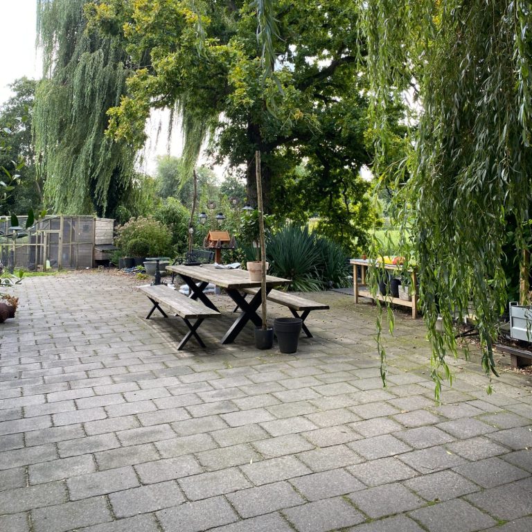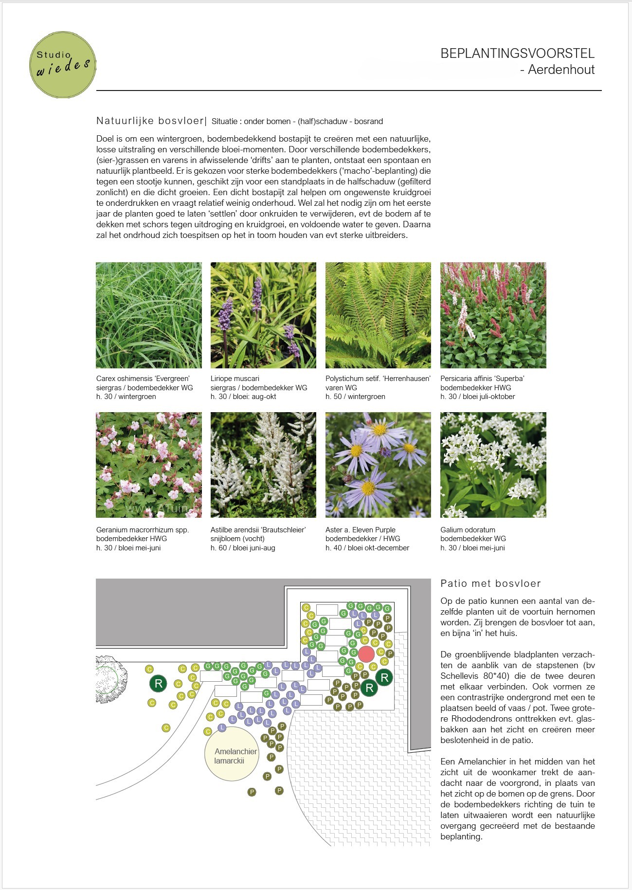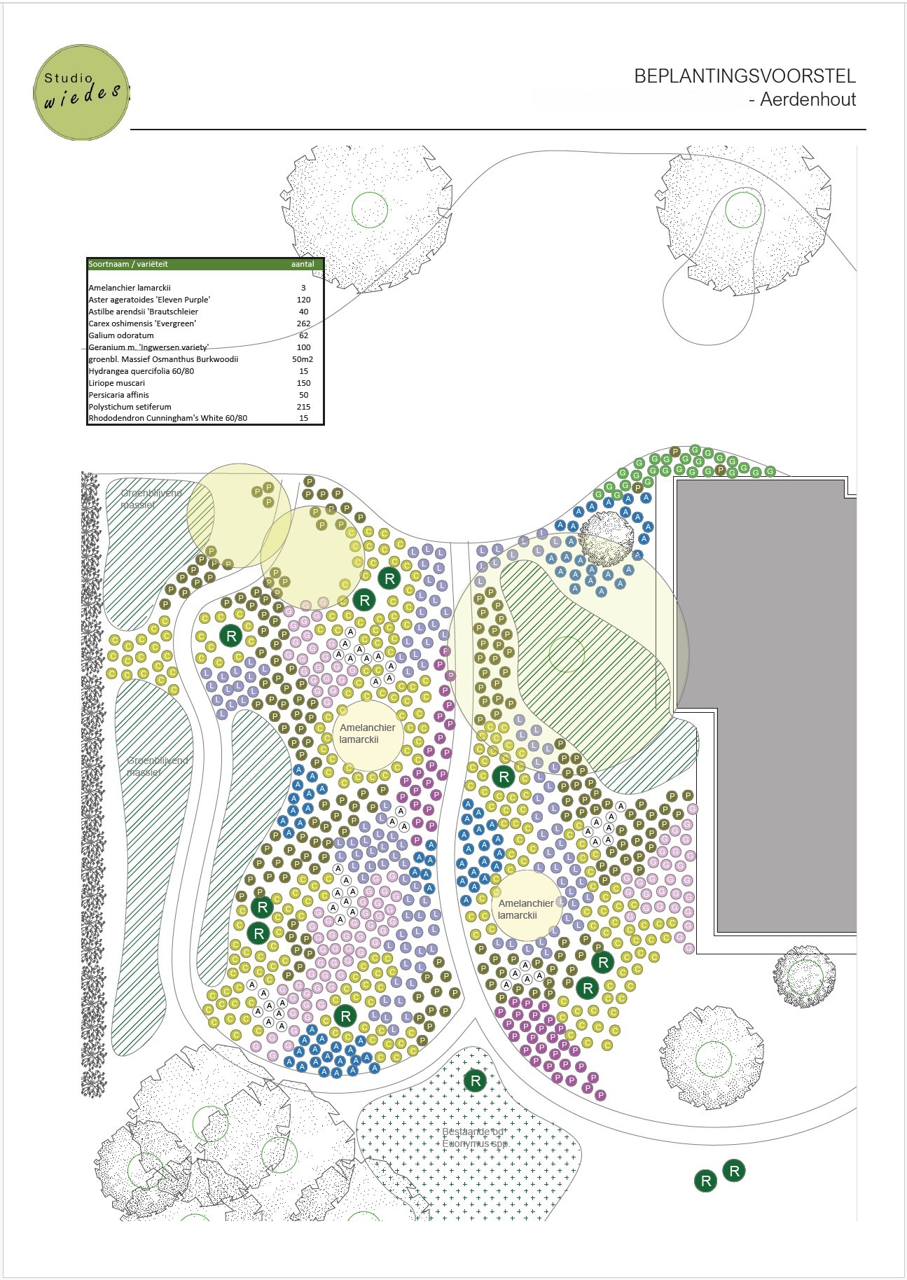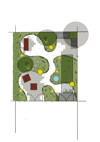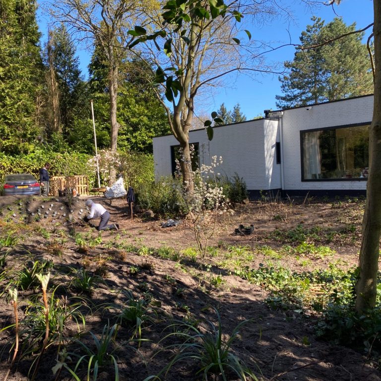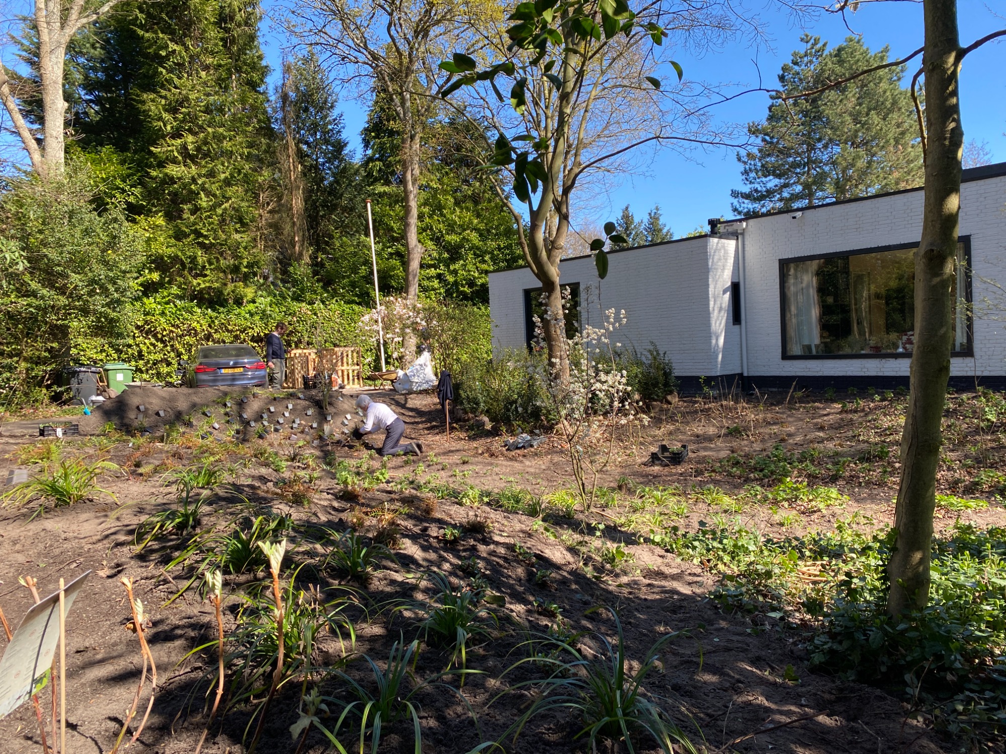 Het ontwerp richtte zich in eerste instantie op het ontharden en vergroenen rond het huis. Door een groot aantal tegels in de oprit en de terrassen te ‘wippen’ ontstonden er nieuwe plantvakken die de beplanting dichterbij de woning brachten. Ook werd een pergola voorzien om samen met de plantvakken de grote open ruimte op te delen in kleinere ‘kamers’ en zo meer beslotenheid te creëren.