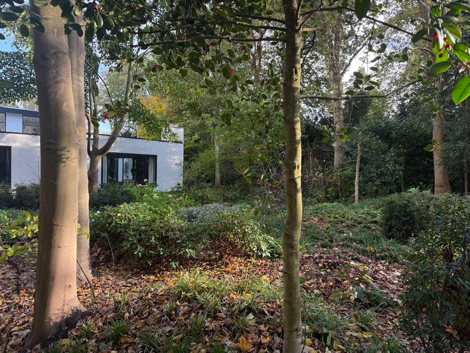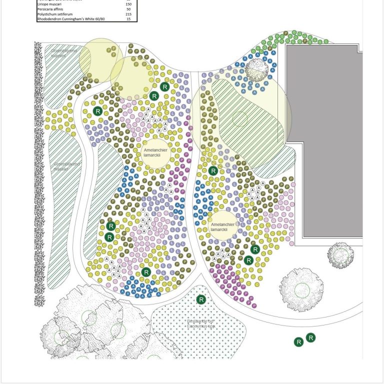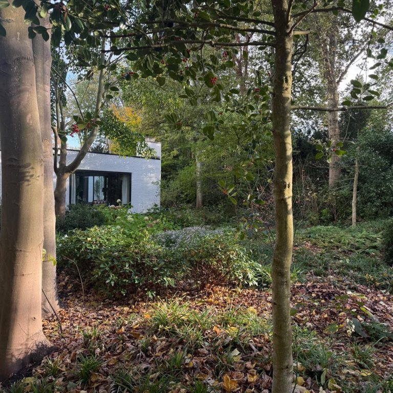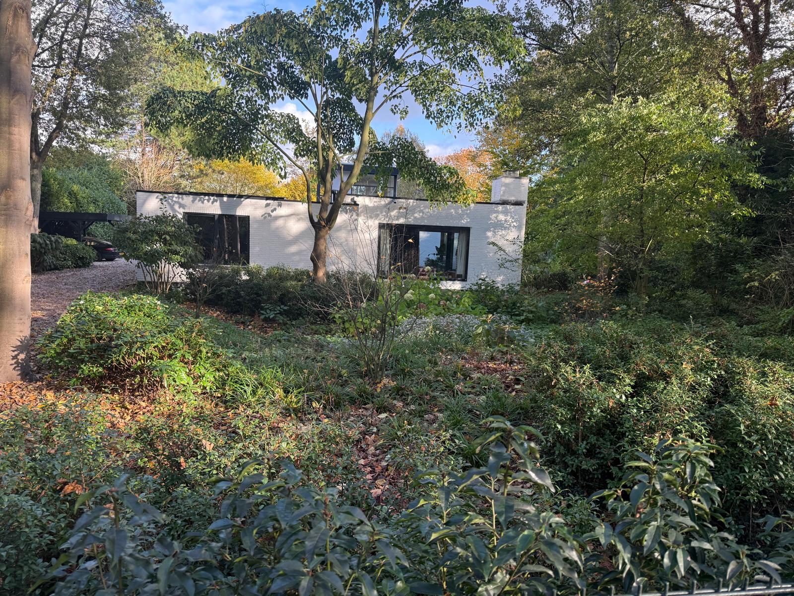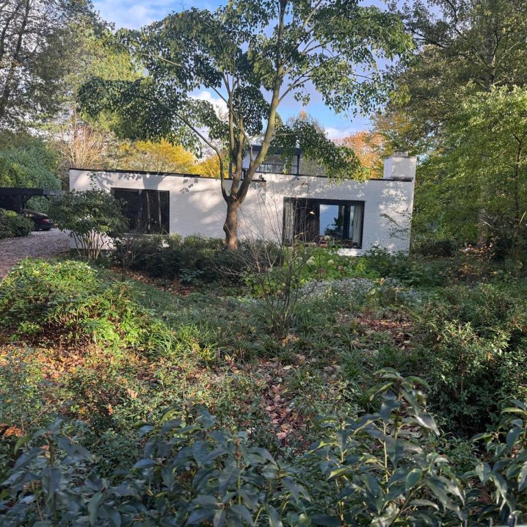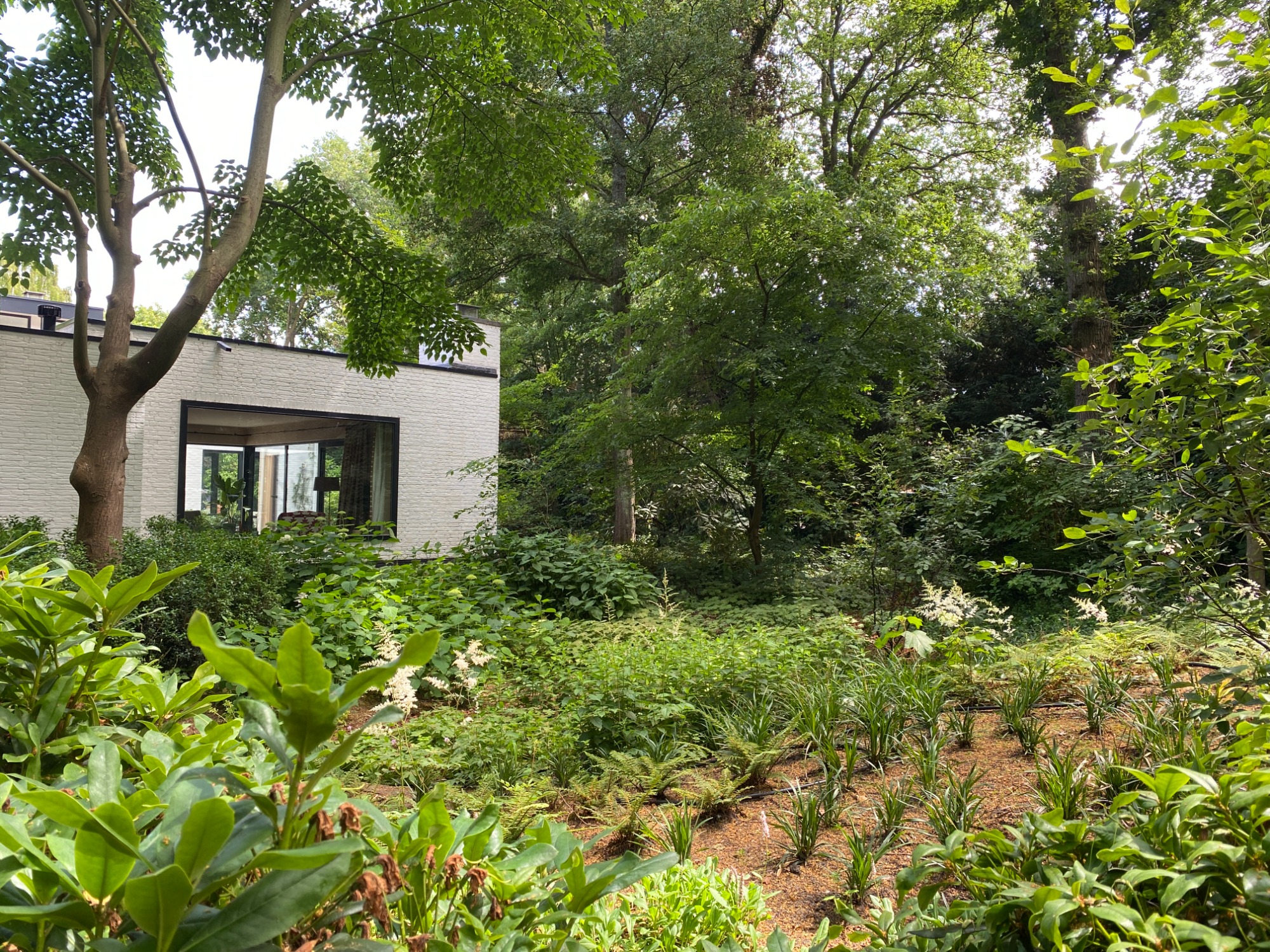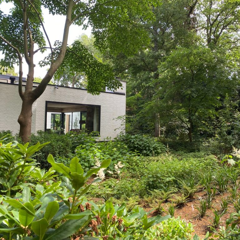 Met de aanplant van enkele meerstammige Amelanchiers en een aantal Hydrangea’s quercifolia ontstond meer gelaagdheid onder de hoge toppen van de bestaande bomen. De mooie herfstverkleuring van deze heesters geeft ook meer seizoensbeleving in de tuin. Tot slot brachten enkele witte Rhododendrons door de gehele tuin rondom het huis meer eenheid tussen de verschillende ruimtes.