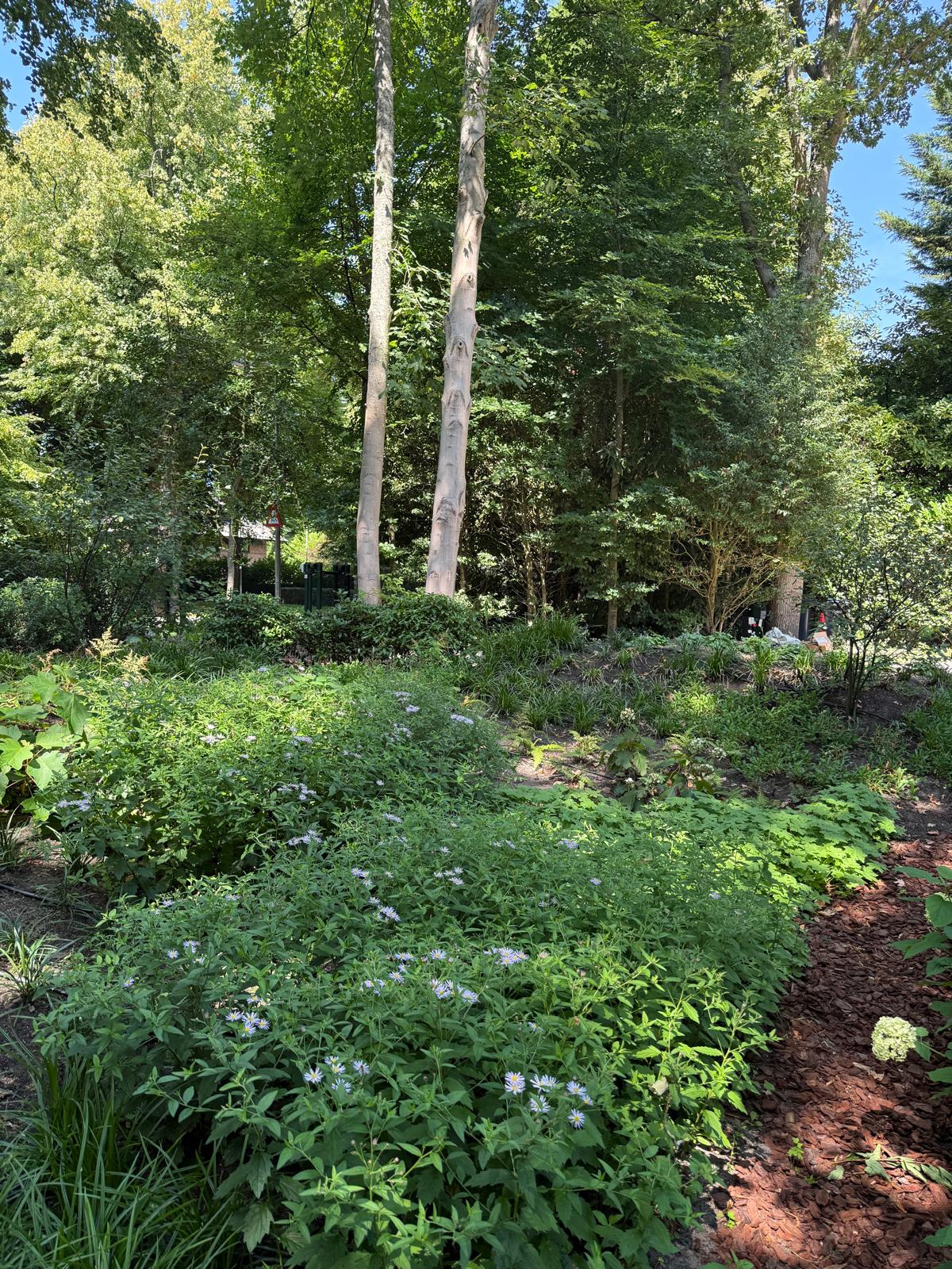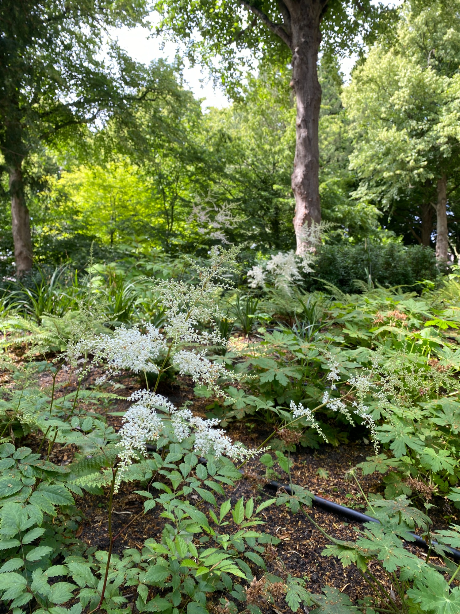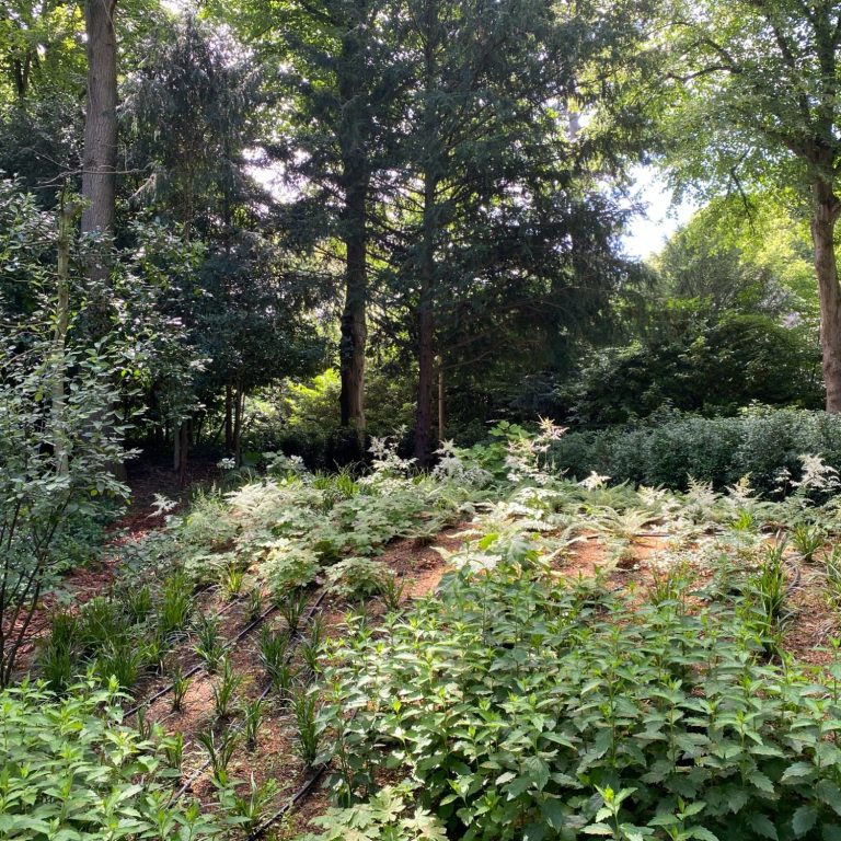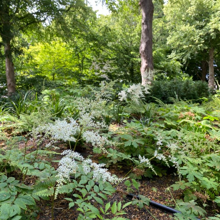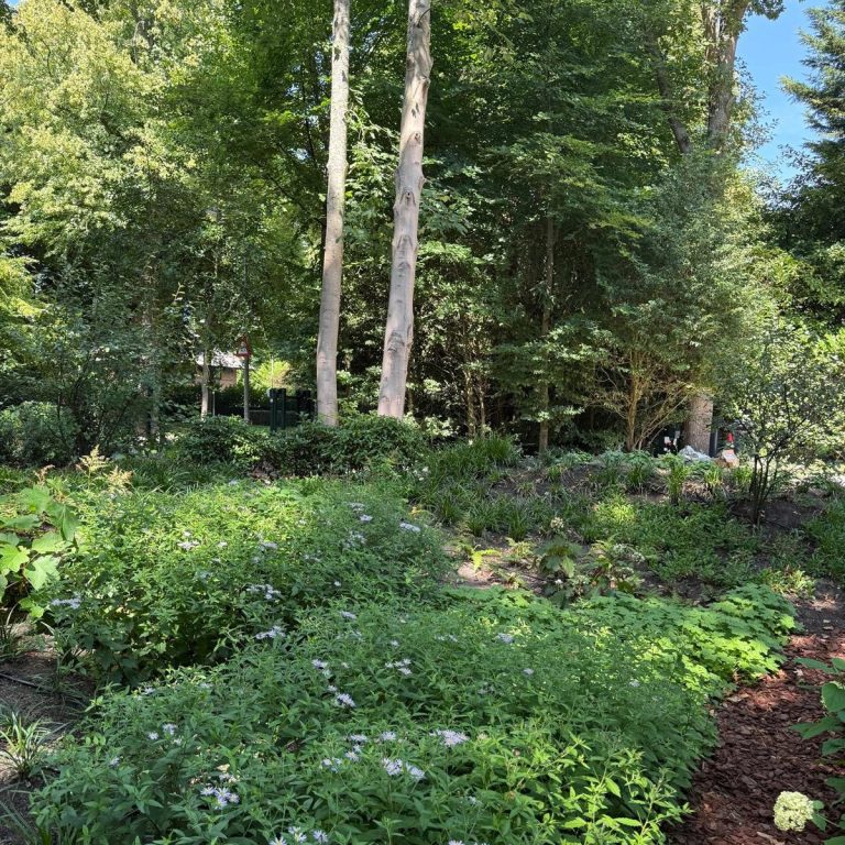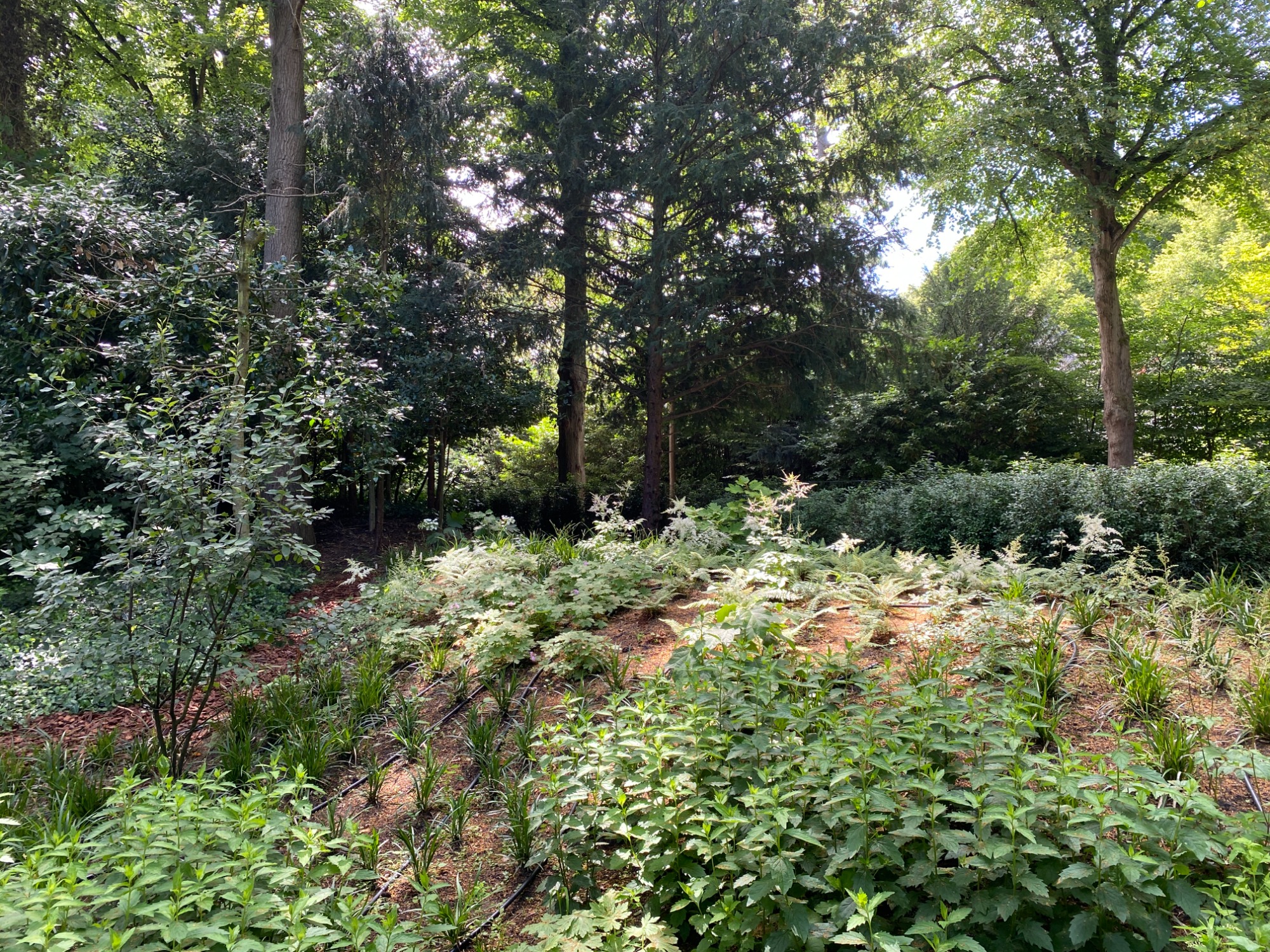 Met de aanplant van enkele meerstammige Amelanchiers en een aantal Hydrangea’s quercifolia ontstond meer gelaagdheid onder de hoge toppen van de bestaande bomen. De mooie herfstverkleuring van deze heesters geeft ook meer seizoensbeleving in de tuin. Tot slot brachten enkele witte Rhododendrons door de gehele tuin rondom het huis meer eenheid tussen de verschillende ruimtes.
