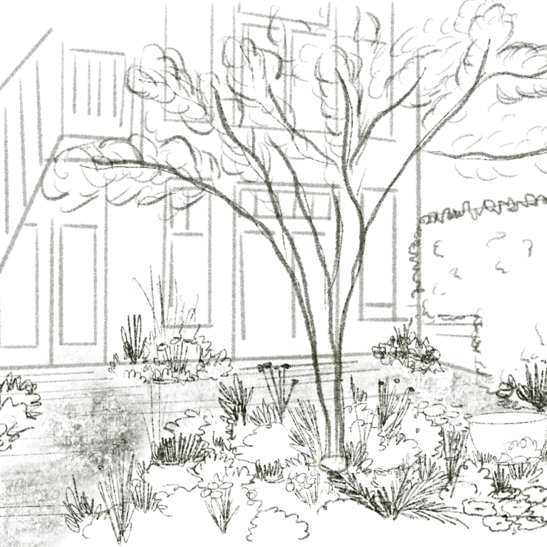 Voor een bestaande tuin rondom een nieuwe woning zochten de eigenaren ideeën om meer variatie en blikvangers aan te brengen in de schaduwrijke voortuin.