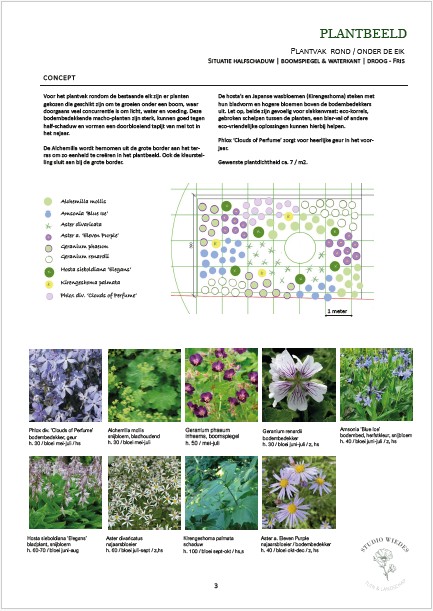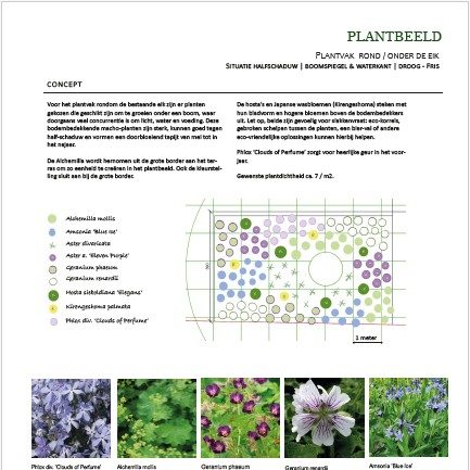 De aanleg van een gecultiveerde bloemenborder vormt een natuurlijke overgang tussen het terras en het aangrenzende grasland. Door voor een organische vorm te kiezen worden de harde randen van het terras verzacht. De beplanting is geïnspireerd op een Engelse ‘cottage’ garden in zachte tinten geel, blauw en paars.